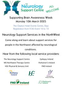 All are welcome and you will get to hear from the following providers: The Neurology Support Centre, MS Northwest Therapy Centre, HSE Physical & Sensory Unit, Epilepsy Ireland, Parkinson's Ireland and FND Ireland